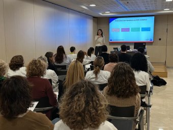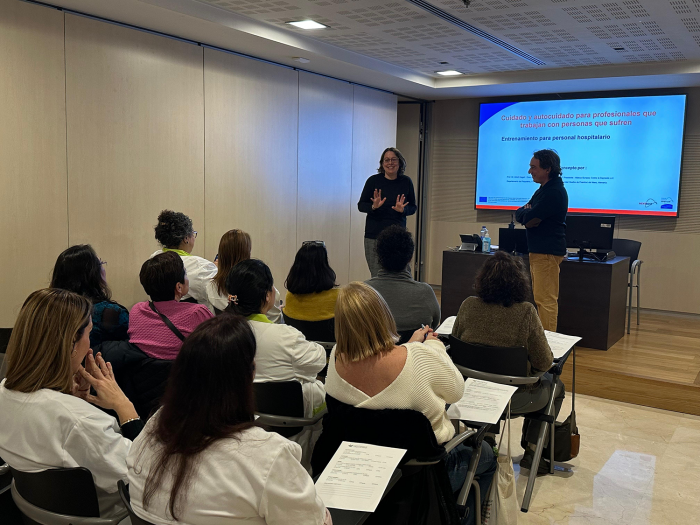 En este contexto, se ha impartido una formación dirigida a los distintos colectivos profesionales del Hospital, orientada a trabajar el bienestar emocional y la gestión del estado de ánimo, con el objetivo de proporcionar herramientas tanto para el autocuidado de las y los profesionales como para una mejor atención y acompañamiento a los pacientes. La sesión ha ofrecido recursos prácticos para reconocer problemáticas como el estrés, la ansiedad o la depresión, identificar factores de riesgo en la vida cotidiana y desarrollar estrategias de autocuidado y resiliencia. La formación ha combinado breves explicaciones con talleres de relajación y mindfulness, dinámicas de grupo, análisis de casos y recursos digitales para facilitar que las personas participantes puedan incorporar los aprendizajes a su día a día.