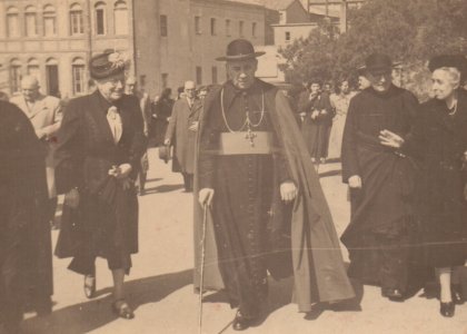 Visita del bisbe, Dr. Modrego, acompanyat per la Sra. Poal, Presidenta de l'Associacio de l'Hospital de l'Esperit Sant