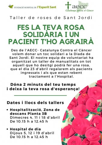 La Asociación Española Contra el Cáncer (AECC) organiza durante las próximas semanas una serie de talleres de manualidades para que pacientes y profesionales hagan su rosa de Sant Jordi solidaria. Este pequeño obsequio se repartirá durante la Diada entre los pacientes ingresados en el centro y los que estén recibiendo tratamiento.