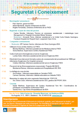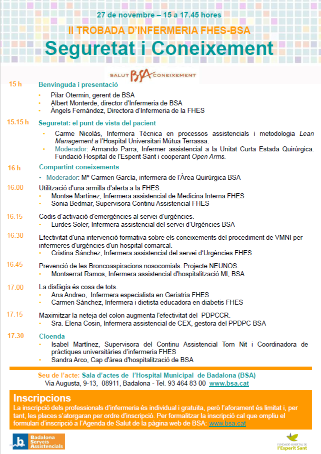El próximo 27 de noviembre tendrá lugar la segunda jornada conjunta entre enfermería del Hospital de l'Esperit Sant y Badalona Serveis Assistencials. Compartir conocimientos y experiencias entre los profesionales de ambos centros es el eje de la jornada que se llevará a cabo en la Sala de Actos del Hospital Municipal de Badalona, de 15 a 17.45 horas. La seguridad será uno de los temas importantes de la jornada.
