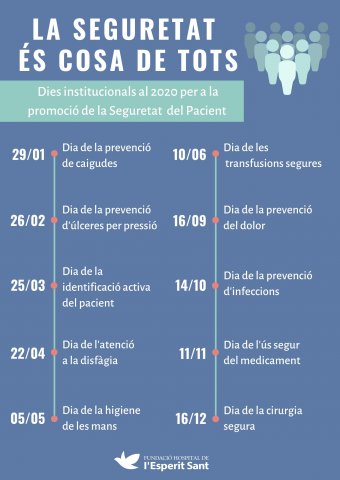 "La Seguridad es cosa de todos 2020" arranca mañana día 29 de enero con el Día institucional de la Prevención de caídas. Seguirán las jornadas dedicadas a la prevención de las úlceras por presión (26 de febrero), la identificación activa del paciente (25 de marzo), la atención a la disfagia (22 de abril), la higiene de manos (5 de mayo ), las transfusiones seguras (10 de junio), la prevención del dolor (16 de septiembre), la prevención de las infecciones (14 de octubre), el uso seguro del medicamento (11 de noviembre) y la cirugía segura (16 de diciembre).