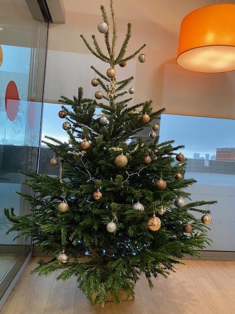 El árbol se ha instalado en la cafetería y adorna el Hospital, junto con el árbol del vestíbulo, la iluminación exterior y los adornos que ha elaborado muchos de profesionales de la FHES.
