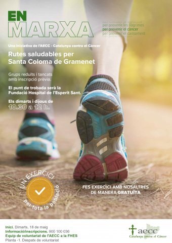 Rutas saludables por Santa Coloma de Gramenet" es un proyecto que tiene la finalidad de generar un espacio de actividad física periódico, para poder adquirir el hábito de hacer ejercicio físico al menos una vez por semana y, al mismo tiempo, pretende ser un espacio de encuentro y de conocimiento del entorno. Ha sido impulsado por la Asociación Española Contra el Cáncer (AECC) a través del equipo de voluntarios de la Fundación Hospital de l'Esperit Sant.