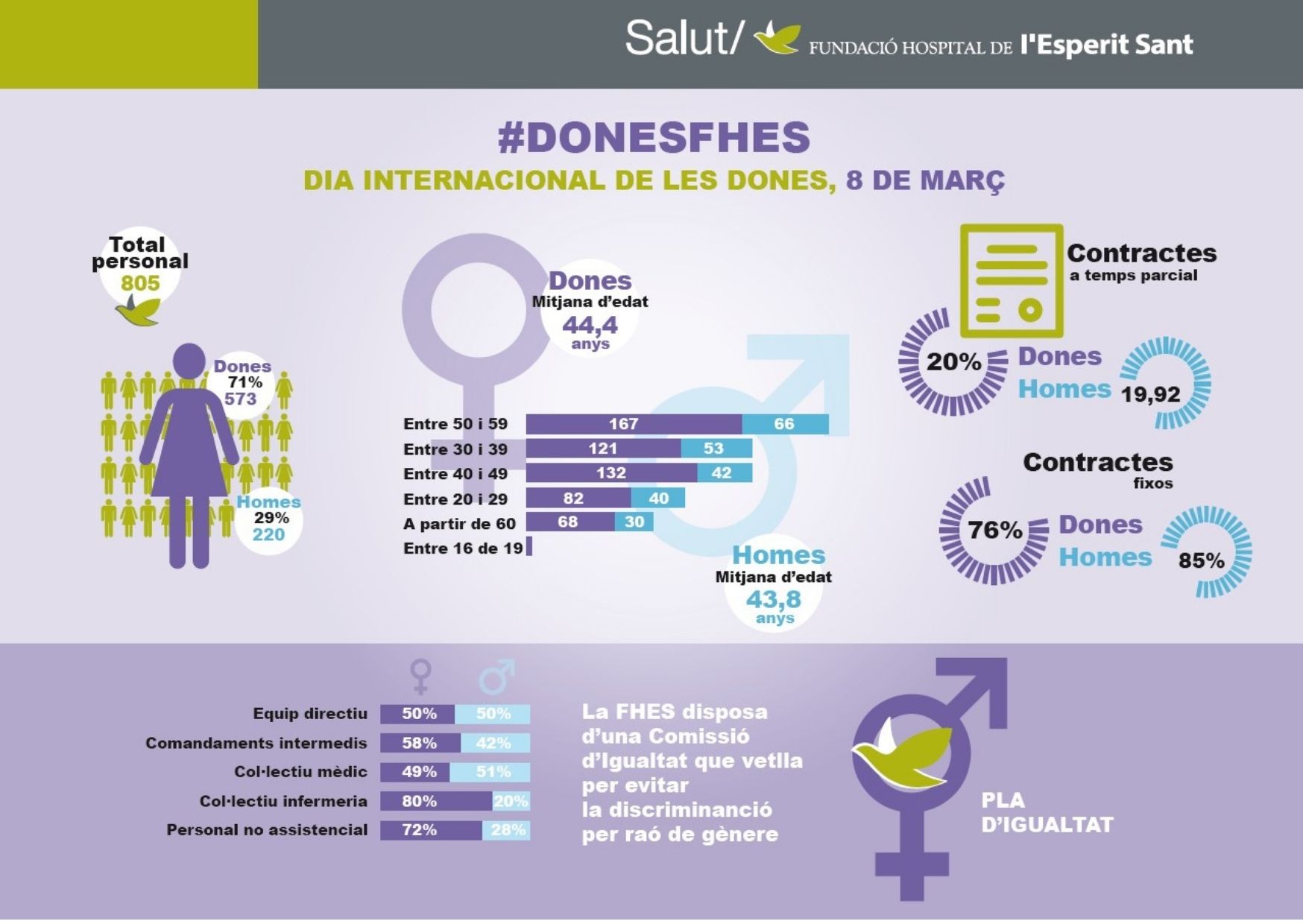De las 573 mujeres trabajadoras en la Fundació Hospital de l'Esperit Sant 89 son médicas, de un total de 183 facultativos/facultativas; 206 son diplomadas en enfermería, de un total de 246 enfermeros/as. También son mayoría las 33 técnicas especialistas sanitarias que trabajan en áreas como el laboratorio, radiología y farmacia, frente a sus 12 compañeros masculinos. Por el contrario, si hablamos de los técnicos en cuidados de enfermería nos encontramos con 140 mujeres y 17 hombres.