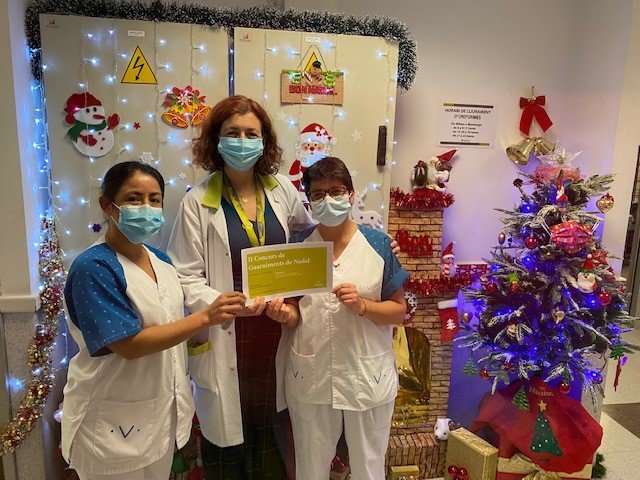 El equipo ganador ha sido el grupo de Hospitalización de la Planta 3B (turno de tarde), formado por formado por Ana Jiménez, Miriam Ribas, Juan Cañadas, Francisco Berenguer y Noelia Lozano. Esta propuesta consiste en la elaboración de una carretilla de paros con diferentes elementos hechos a mano, que se complementa con diferentes figuras y motivos navideños colgados a las puertas de las habitaciones. El jurado ha valorado, de forma unánime, la originalidad y la creatividad del equipo. El primer premio está dotado con un vale de 100 euros por una comida/cena.
