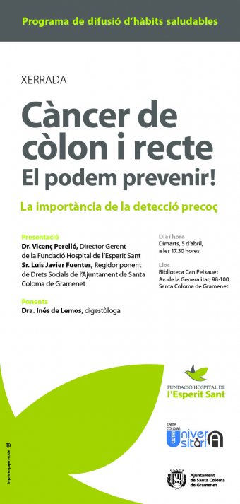 Para explicar estos y otros aspectos relacionados con la enfermedad, la Dra. Inés de Lemos, digestóloga, impartirá el día 5 de abril (17.30h) en Santa Coloma la charla "Cáncer de colon y recto. ¡Lo podemos prevenir! La importancia de la detección precoz". La sesión, que forma parte del Programa de difusión de hábitos saludables de la FHES, tendrá lugar en la Biblioteca Can Peixauet. Presentarán el acto el Dr. Vicente Perelló, Director Gerente de la FHES, y el Sr. Luis Javier Fuentes, Concejal ponente de Derechos Sociales del Ayuntamiento de Santa Coloma de Gramenet.