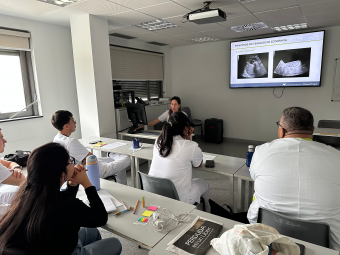 La primera sesión comenzó con el Dr. Eduardo Rul·lan Palou, médico adjunto de Urgencias, quien abordó el tema de las intoxicaciones, una de las causas más frecuentes de consulta. A continuación, la Dra. De la Red profundizó en la enfermedad tromboembólica, explicando los aspectos más relevantes para su diagnóstico y tratamiento. Posteriormente, la Dra. Raquel Becerra presentó el uso de la ecografía a pie de cama (POCUS), una herramienta cada vez más importante para los profesionales de urgencias.