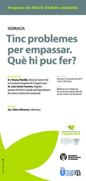 De estas pautas para facilitar la deglución hablará Silvia Olivares, enfermera del Hospital, en la charla "Tengo problemas para tragar. ¿Qué puedo hacer?" prevista para el martes 3 de octubre a las 17.30 horas en la Biblioteca Can Peixauet de Santa Coloma de Gramenet. La actividad forma parte de Programa de difusión de hábitos saludables del Hospital.
