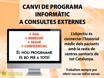 Avui dijous 1 de març, l'Hospital canvia el programa informàtic de l'Àrea de Consultes Externes. L'objectiu d'aquesta innovació és connectar l'historial mèdic dels pacients de l'Esperit Sant amb la resta de centres sanitaris de tot Catalunya.