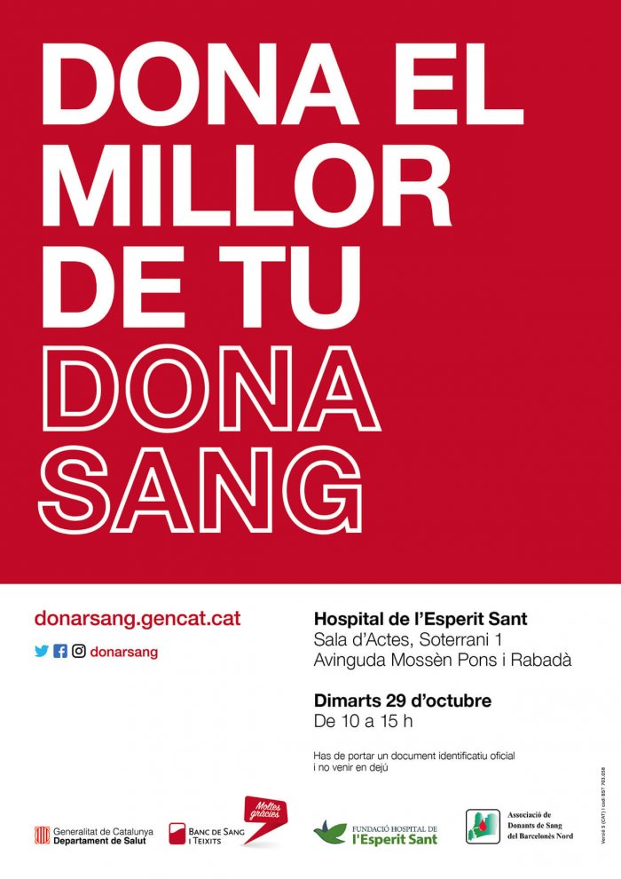 El Banc de Sang i Teixits organitza una nova campanya de donació de sang dimarts 29 d'octubre a l'Hospital de l'Esperit Sant. Els treballadors, usuaris i acompanyants que hi vulguin col·laborar podran fer-ho dirigint-se al vestíbul de la Sala d'Actes, situada al Soterrani 1 de l'Hospital, de 10 a 15 hores.