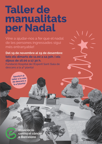 L'equip de voluntaris de l'Associació Contra el Càncer de l'Hospital, oferirà setmanalment (els dimarts i els dijous) un taller de manualitats de Nadal que começaran dimarts 19 de novembre i acabaran el dijous 19 de desembre.